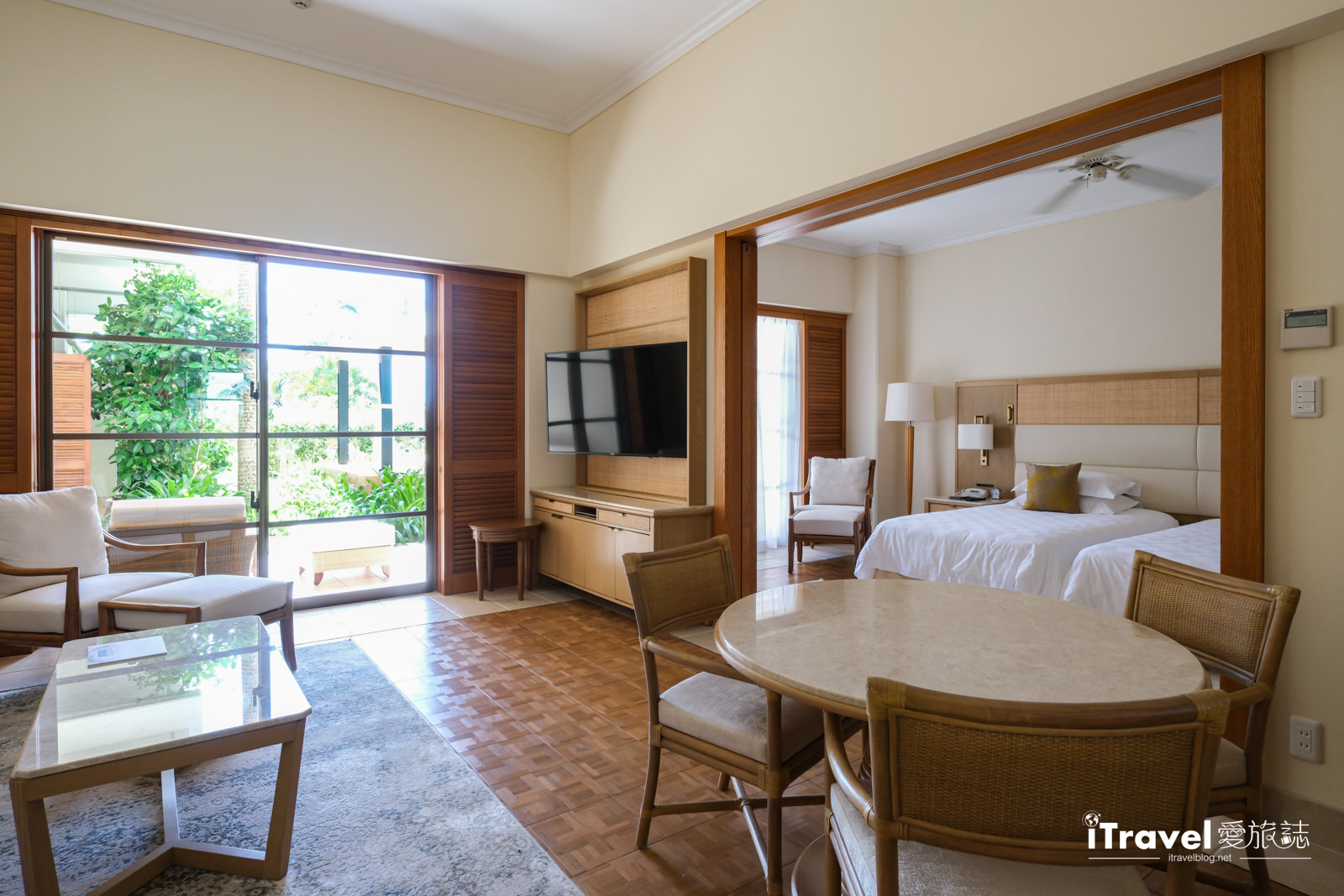 此次入住标准楼层的豪华海滨客房,房间采用温暖色调又典雅的布置,搭配热带风情的家具,加上海外露天阳台的无边海景,都让人觉得放松又神清气爽,采用两张单床合并的好莱坞双床配置,一家三口晚上则可以睡得相当舒适。 (🔎订房价格与住宿评价:AGODA|booking.com)